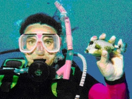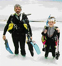 | Anne with Heime. Heime is the diving instructor that certified me. He now runs his own dive business. Give him a call if you're interested in learning how to dive. If you see a flyer for Scuba Plus pick one up, that's Heime. | A White-spotted Filefish in its orange phase. | Breaking in the next generation: my my nephew, Paulie, after his first exposure to SCUBA at Baby Beach. |