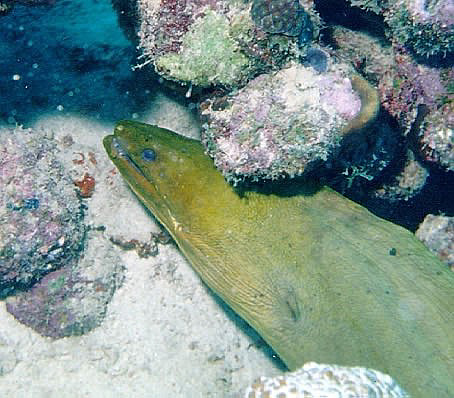 Large Green Moray Eels can be easily found around Aruba. This guy was hiding in a hole, naturally, and I set up waiting for him to peek out so I could get a good head shot. I waited and he stayed right where he was. Then Anne, brave little Annie, saw his tail coming out of the other end of the hole. She rubbed him and the next thing I knew he was looking out at me. I got this once chance for a picture and that was it. |