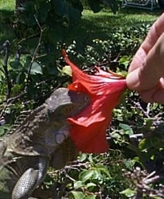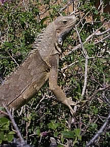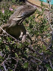 Anne and I are, by nature, animal lovers. Animals of all kinds and, I guess, you might consider us reptile lovers as well. No we aren't into snakes! But we can handle these fellows quite easily. Aruba has an abundance of iguanas. They come in all sizes and several different colors. They can be seen scurrying back and forth just about anywhere. One of the favorite places to find the larger iguanas is by the hotel pools. They congregate there during the day to sunbathe on the warm rocks and, I suspect, for the free handouts that they've learned is theirs for the asking. While they will eat healthy stuff like lettuce and bread, we've found them absolutely addicted to the hibiscus flower. Hibiscus flower bushes can be found almost every where and the flowers are plentiful. Pick a few flowers and sit by the pool's edge; you'll soon be joined by several looking to be fed. They are (or so we've always found) harmless and you should have no fear feeding them by hand. They are known to try and devour the entire flower in one bite so watch your fingers! Oh, don't move to fast because they will definitely run away. | ||