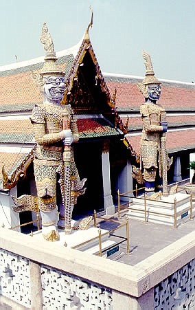 Large statues of mystical figures stood guard at the entrance to one of the Grand Palace's temples. They were decorated with beautifully colored ceramic tiles and easily allowed one to imagine the majesty that was once the Kingdom of Siam. | ![]() |