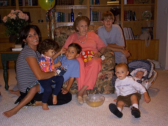| Evelyn and her great-grandchildren: Granddaughter Jeannette holding Alyssa, age 2, Christopher, age 7, Niko, age 18 months and Anthony John, age two months. Paulie, an honorary nephew, age 14. |