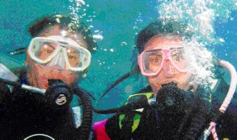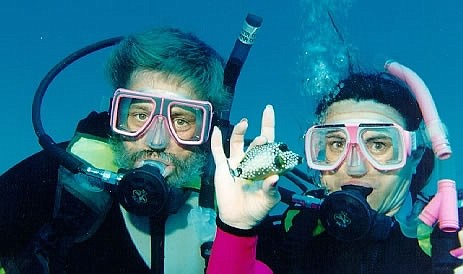 | Anne with Heime. Heime is the diving instructor that certified me. He now runs his own dive business. Give him a call if you're interested in learning how to dive. If you see a flyer for Scuba Plus pick one up, that's Heime. | A White-spotted Filefish in its orange phase. | Breaking in the next generation: my my nephew, Paulie, after his first exposure to SCUBA at Baby Beach. |