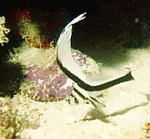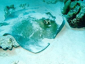 | Southern Stingrays are also common around Aruba. This one was concealed on the bottom and covered almost completely with sand. Anne, known for her "eagle eyes," spotted him first and called my attention to him. As I moved in to take the picture he began to scurry off but not before I got this picture. | ![]() |