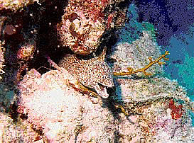 Large Green Moray Eels can be easily found around Aruba. This guy was hiding in a hole, naturally, and I set up waiting for him to peek out so I could get a good head shot. I waited and he stayed right where he was. Then Anne, brave little Annie, saw his tail coming out of the other end of the hole. She rubbed him and the next thing I knew he was looking out at me. I got this once chance for a picture and that was it. |