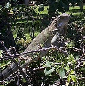 Anne and I are, by nature, animal lovers. Animals of all kinds and, I guess, you might consider us reptile lovers as well. No we aren't into snakes! But we can handle these fellows quite easily. Aruba has an abundance of iguanas. They come in all sizes and several different colors. They can be seen scurrying back and forth just about anywhere. One of the favorite places to find the larger iguanas is by the hotel pools. They congregate there during the day to sunbathe on the warm rocks and, I suspect, for the free handouts that they've learned is theirs for the asking. While they will eat healthy stuff like lettuce and bread, we've found them absolutely addicted to the hibiscus flower. Hibiscus flower bushes can be found almost every where and the flowers are plentiful. Pick a few flowers and sit by the pool's edge; you'll soon be joined by several looking to be fed. They are (or so we've always found) harmless and you should have no fear feeding them by hand. They are known to try and devour the entire flower in one bite so watch your fingers! Oh, don't move to fast because they will definitely run away. | ||