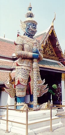 Large statues of mystical figures stood guard at the entrance to one of the Grand Palace's temples. They were decorated with beautifully colored ceramic tiles and easily allowed one to imagine the majesty that was once the Kingdom of Siam. | ![]() |