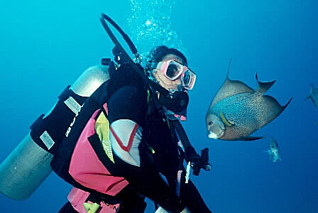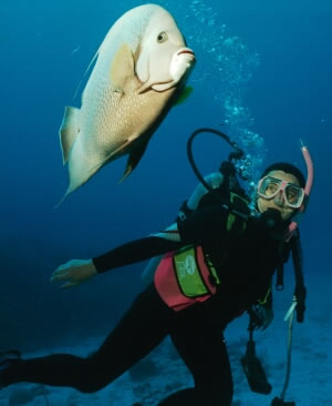 ![]() Anne with one of the friendly Gray Angels at Sunset House Reef, Grand Cayman |
