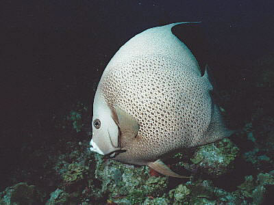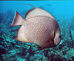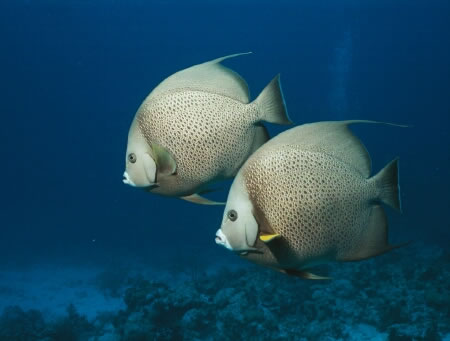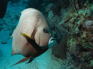 Sunset House. The coral may not be spectacular, but there is an abundance of fish life to photograph. Among them, two very friendly Gray Angels who follow you around like a puppy dog. Of course they're looking for a handout which many of the divers provide. They're beautiful, friendly and approachable. |